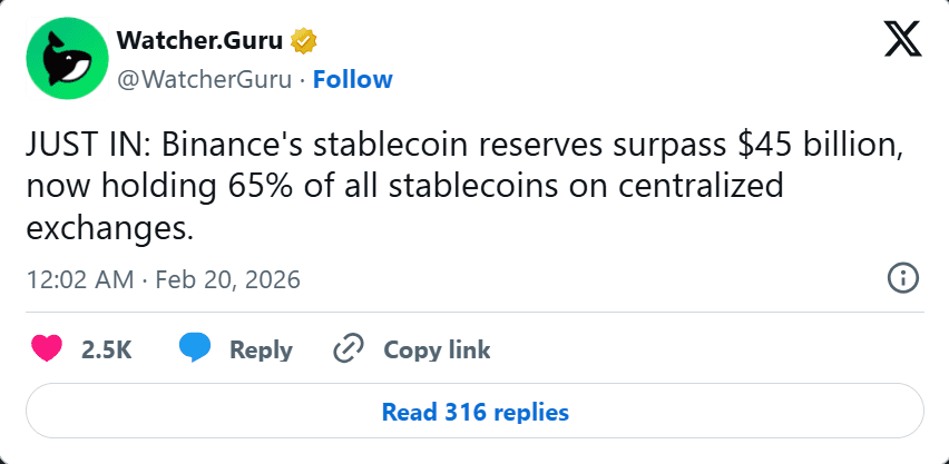 Stablecoin balances held on centralized crypto platforms have surged, with Binance now controlling the clear majority. The exchange currently holds more than $45 billion worth of dollar-pegged digital assets, accounting for roughly 65% of all USDT and USDC stored in exchange-managed wallets across the industry.