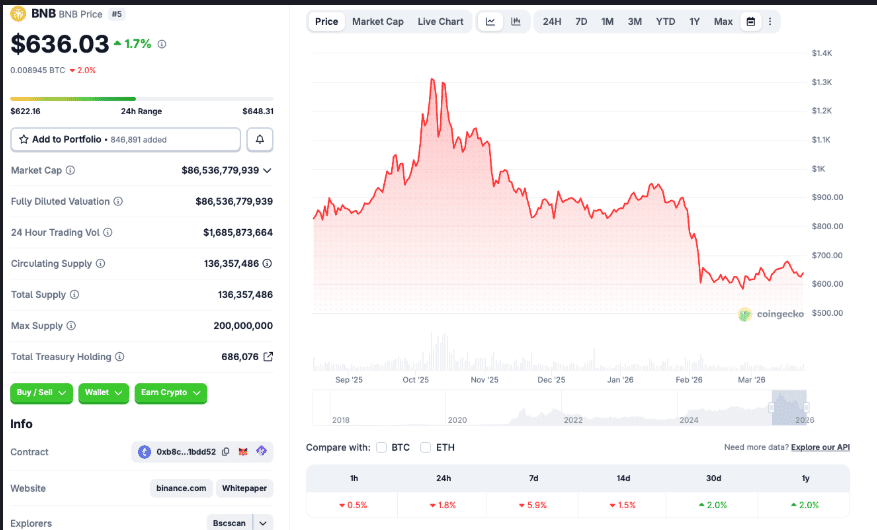 Since hitting its peak, BNB has dropped approximately 53.7%, based on data from CoinGecko. In the shorter term, the asset has declined 1.8% over the past 24 hours, close to 6% over the past week, and about 1.5% over the last two weeks. Despite these setbacks, it has managed to hold modest gains of around 2% on both monthly and yearly timeframes.