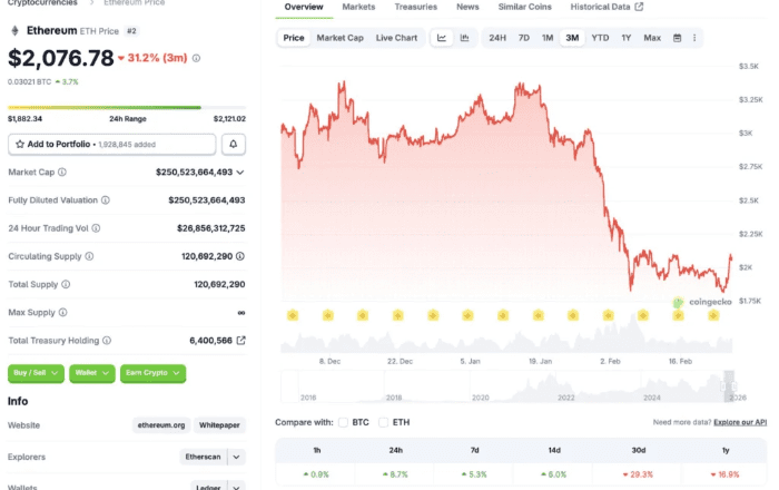 The broader crypto market appears to be stabilizing after its latest pullback, and Ethereum is emerging as one of the standout performers. Over the past 24 hours, ETH has jumped nearly 9%, alongside solid gains across the weekly and biweekly timeframes, based on data from CoinGecko. This performance places Ethereum among the strongest assets within the top ten cryptocurrencies by market capitalization.