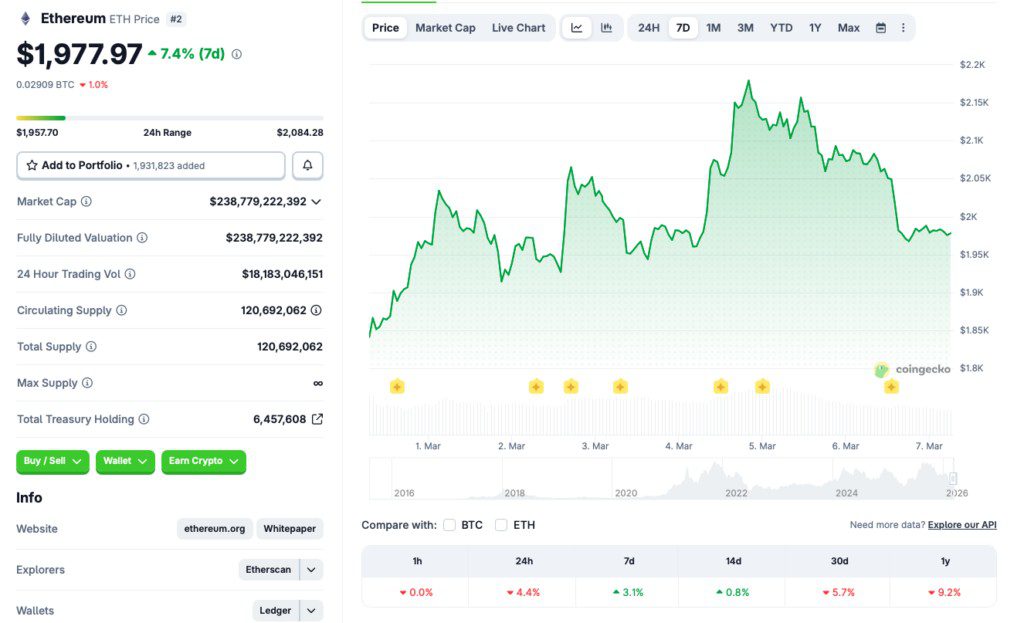 Ethereum (ETH) has slipped below the $2,000 level once more as the broader cryptocurrency market experiences a correction. Data from CoinGecko shows that ETH declined about 4.4% over the past 24 hours. Over the past month, the asset is down approximately 5.7%, and since March 2025, it is down approximately 9.2%.