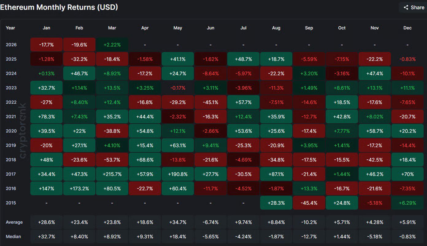 The first two months of 2026 were especially brutal. January saw ETH fall nearly 18%, followed by another drop of almost 20% in February. This marks its most severe losing stretch since 2018, when the asset declined for seven months in a row.