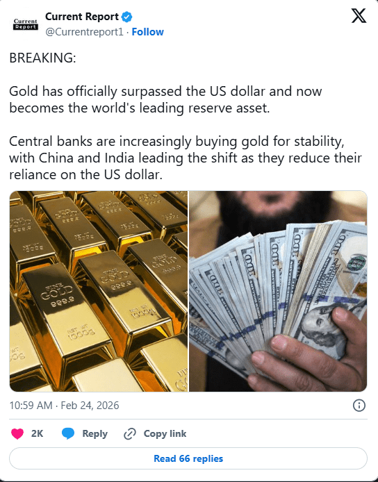 At the same time, gold has strengthened its position as a preferred store of value. In periods of economic stress, investors often turn to precious metals, and gold’s growing dominance has further challenged the dollar’s global standing.