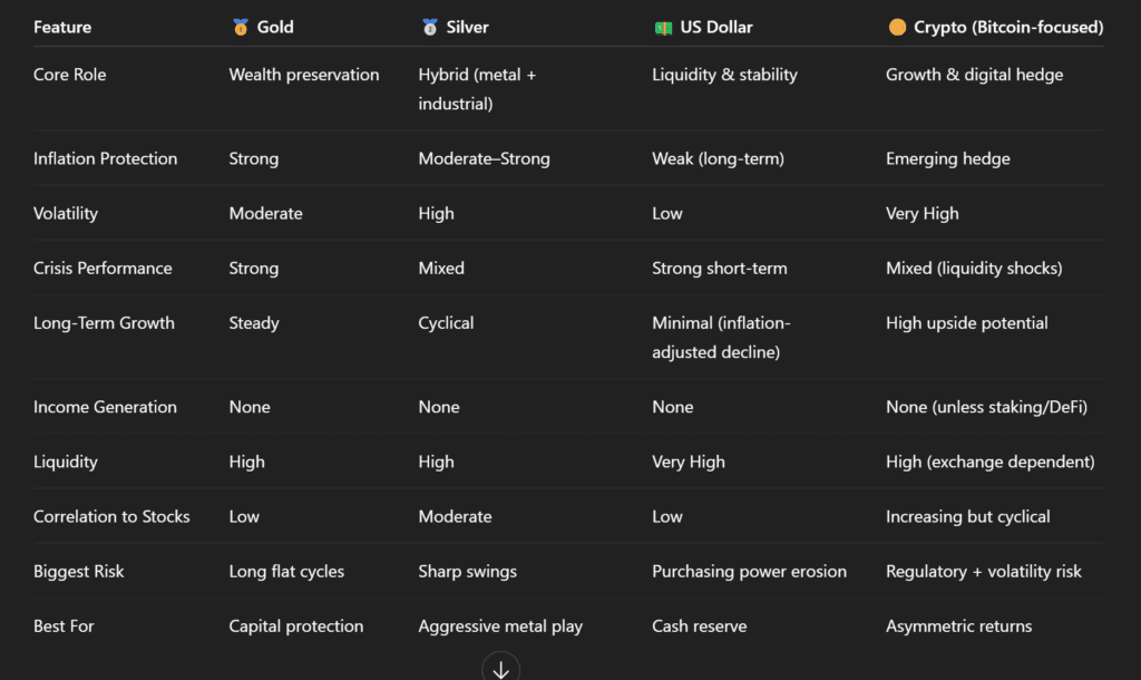 Rather than choosing only one, experienced investors often blend these assets. Holding dollars can provide flexibility, gold can anchor long-term wealth, and crypto exposure can offer growth opportunities for those comfortable with volatility.