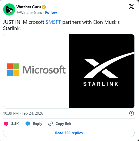 Microsoft has revealed a new collaboration with Elon Musk’s Starlink aimed at improving digital connectivity in remote and underserved regions. Following the news, Microsoft’s shares saw a modest uptick, alongside gains in Starlink’s affiliate, Tesla.