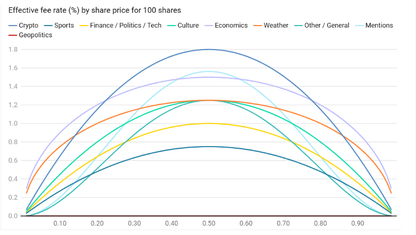 Crypto markets will carry the steepest costs, increasing from about 1.56% to a peak of 1.8%. Sports markets remain the most affordable, rising from 0.44% to 0.75%. For example, a $50 sports trade at even odds will now incur a fee of $0.38, compared to $0.22 previously. Other categories will generally fall within a 1% to 1.56% range.