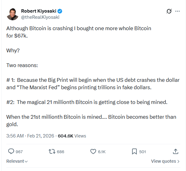 Author and investor Robert Kiyosaki, best known for Rich Dad Poor Dad, says he recently bought one more Bitcoin at around $67,000, even as the price struggled to move higher.
