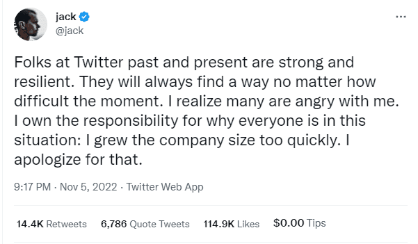 On Saturday, Twitter co-founder Jack Dorsey accepted responsibility for the significant employment losses. He served as Twitter’s CEO twice, the most recent of which lasted from 2015 until 2021.