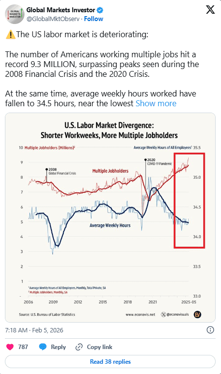 The survey further points to deterioration in the U.S. labor market as a potential catalyst for additional dollar weakness. A record number of Americans are now working multiple jobs, while average weekly hours have dropped close to levels last seen during major economic crises. This combination suggests that many workers are supplementing income out of necessity rather than choice, highlighting underlying fragility in employment conditions.